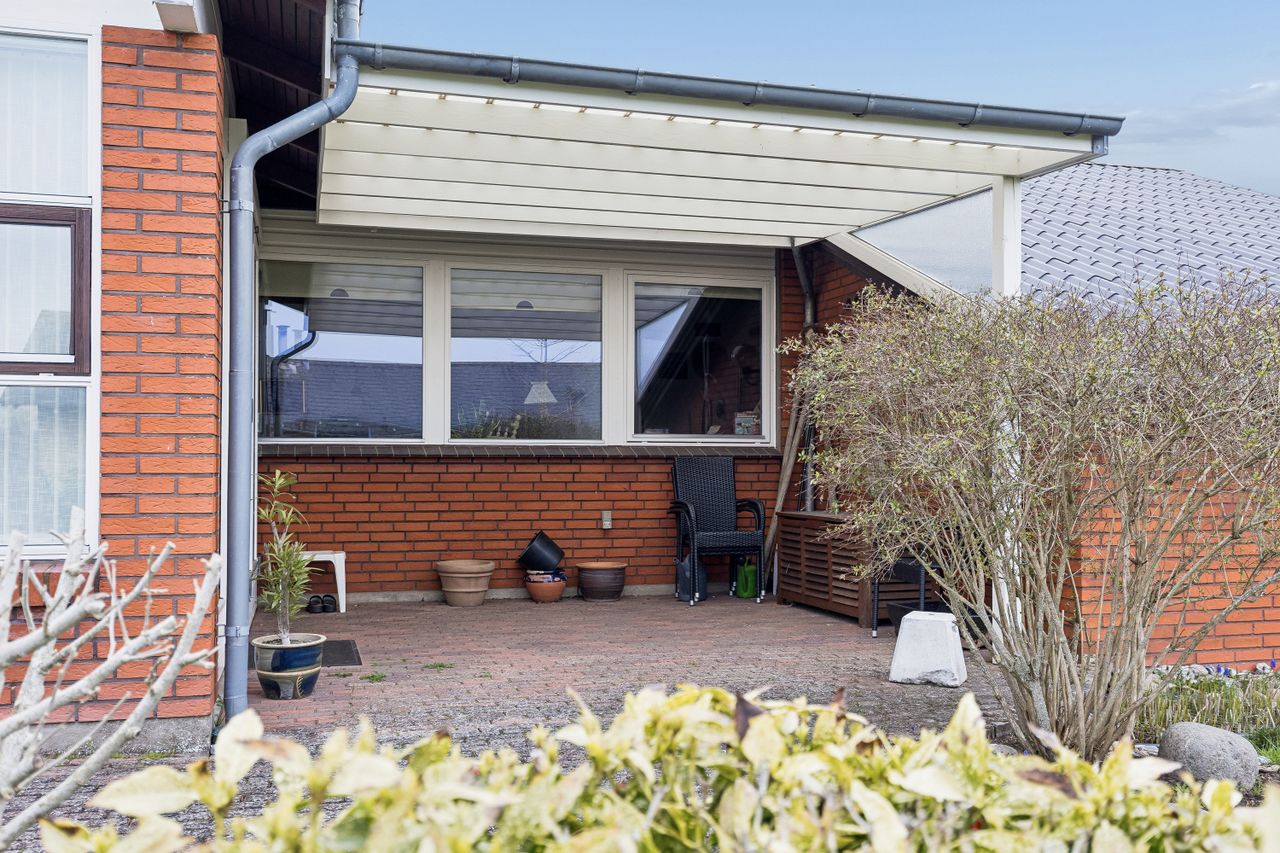 Haven er velanlagt med en lille forhave, og fra stikvejen er der adgang til den murede garage. Bagved er haven lukket og stik sydvendt med optimale solforhold, der kan nydes på en lille fliseterrasse i forbindelse med en overdækket terrasse i vinklen mellem stuen og garagen.