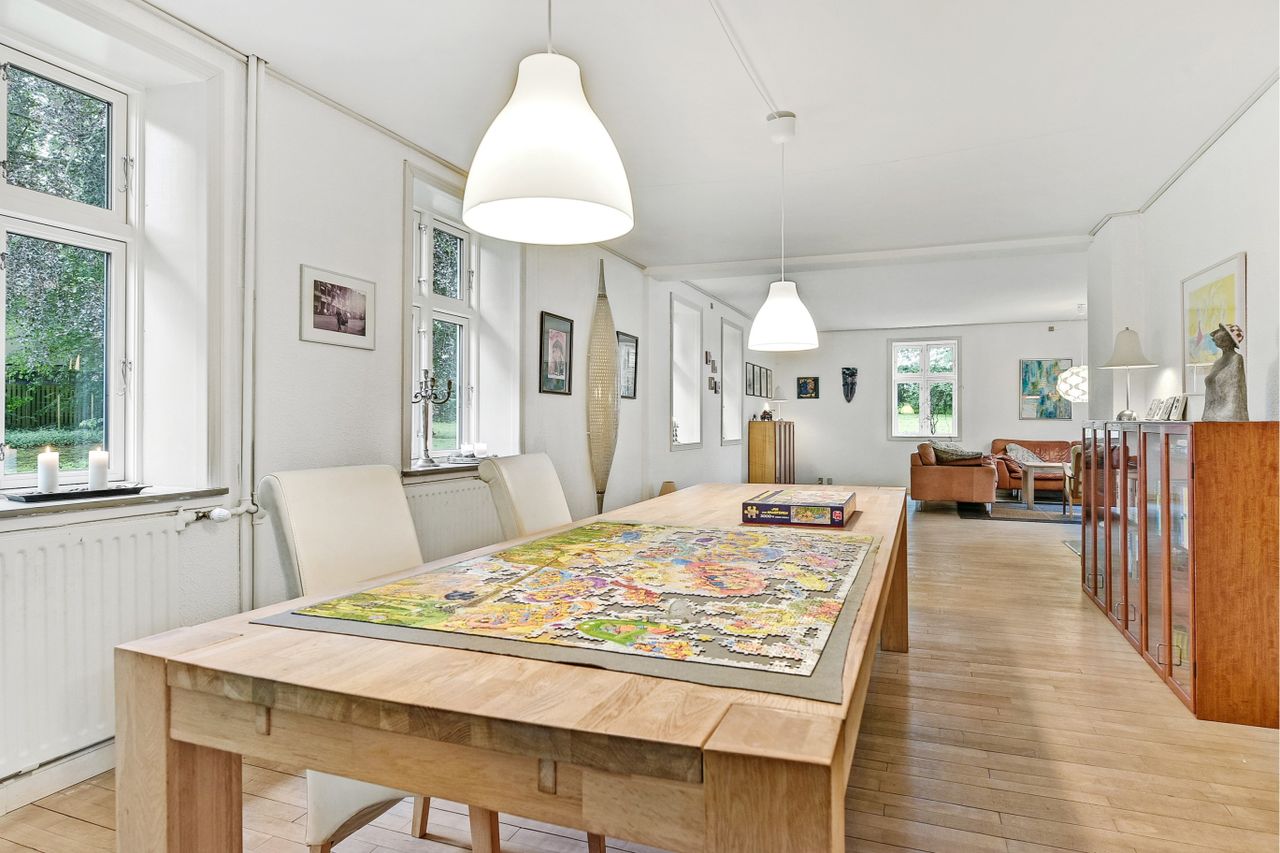 hvor der er masser af plads til at boltre sig. Resten af etagen består af et køkken-alrum med gulvvarme samt en stor og