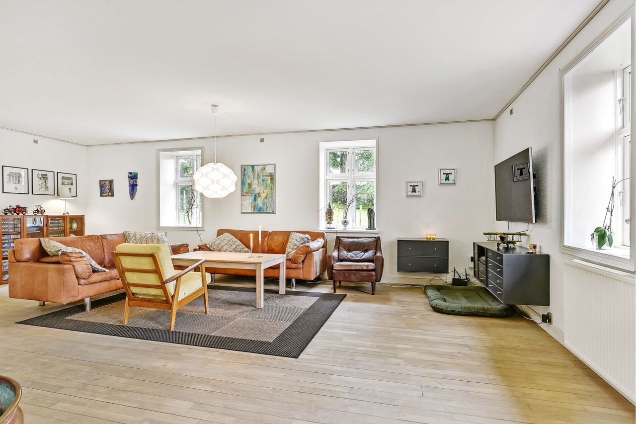 Ejendommens tre længer omkranser en stemningsfuld gårdsplads, og herfra er der adgang til grundens græsarealer.
